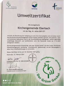 Neben der Eintragungsbekanntmachung-EMAS samt Urkunde, wurde unsere Gemeinde durch die Badische Landeskirche mit einem „Umweltzertifikat“ ausgezeichnet. Landesbischöfin Prof. Dr. Heike Springhart und Dr. André Witthöft-Mühlmann (Landeskirchlicher Umweltbeauftragter) schreiben in der Urkunde: „Die evangelische Kirchengemeinde Eberbach versteht die Bewahrung der Schöpfung als eine ihrer Kernaufgaben und wird dieser durch das kirchliche Umweltmanagement Grüner Gockel vorbildlich gerecht. Die Leitlinien, Ziele und konkreten Maßnahmen sind in der Umwelterklärung niedergelegt, welche regelmäßig unabhängig überprüft und veröffentlicht wird. Die Gemeinde wurde am 11.12.2023 erfolgreich validiert.“